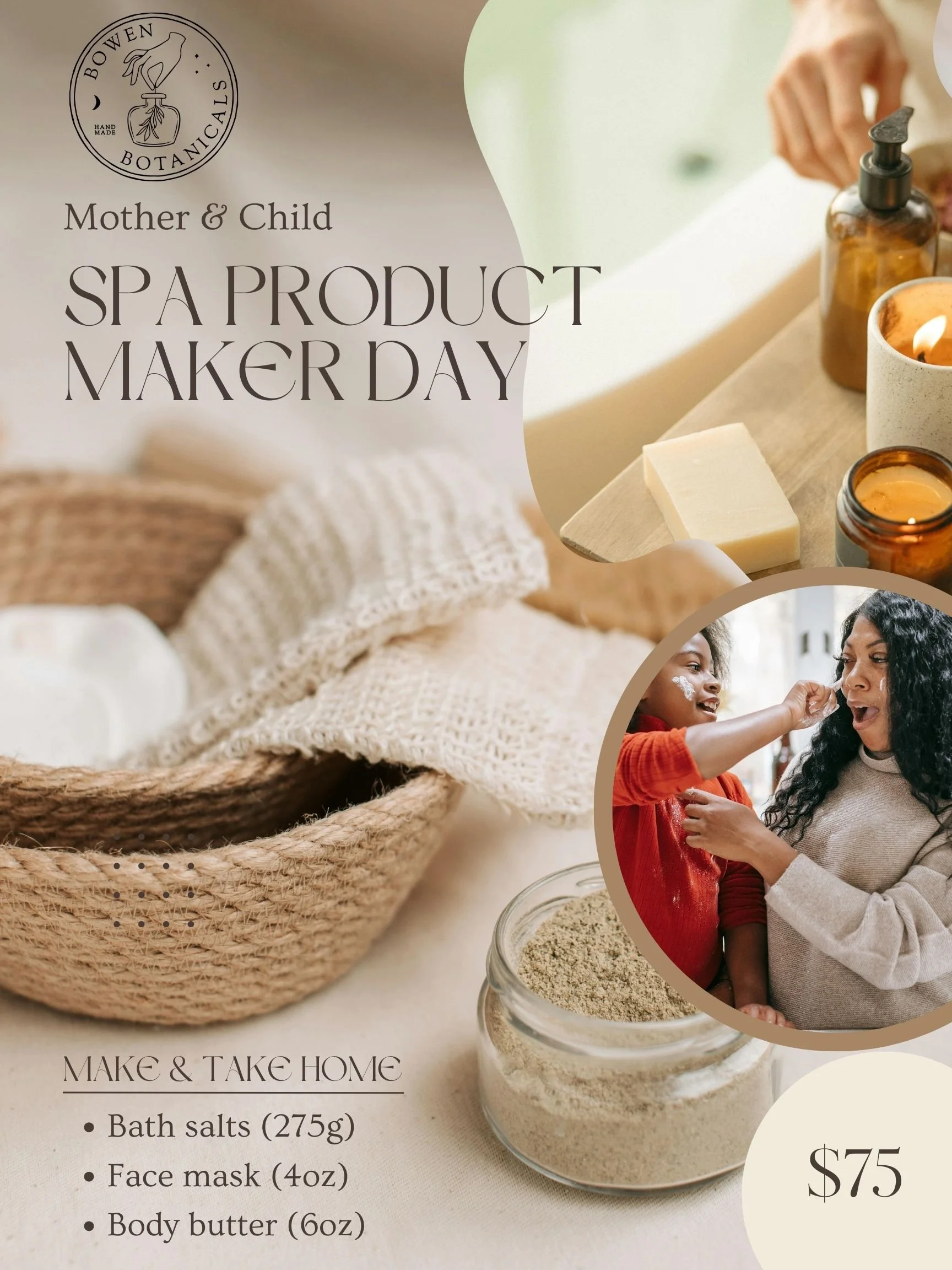 You will go home with a bundle of three pampery products- bath salts, whipped body butter, and clay face mask. Your child will leave inspired and empowered to set you up with an at-home Mother's Day spa experience the following weekend.